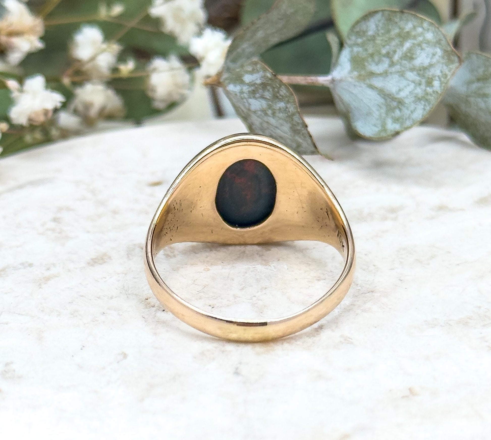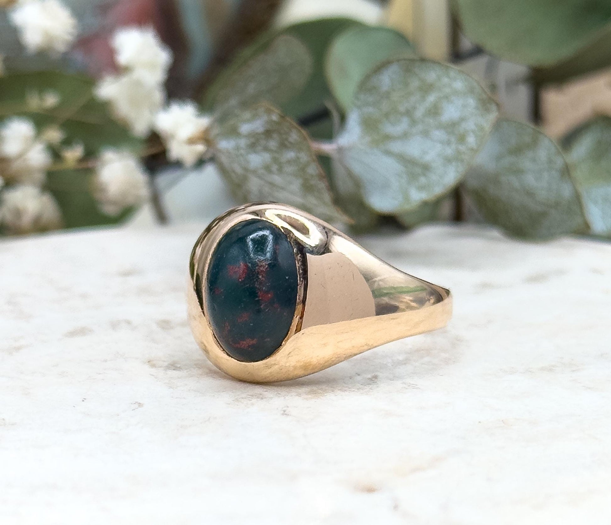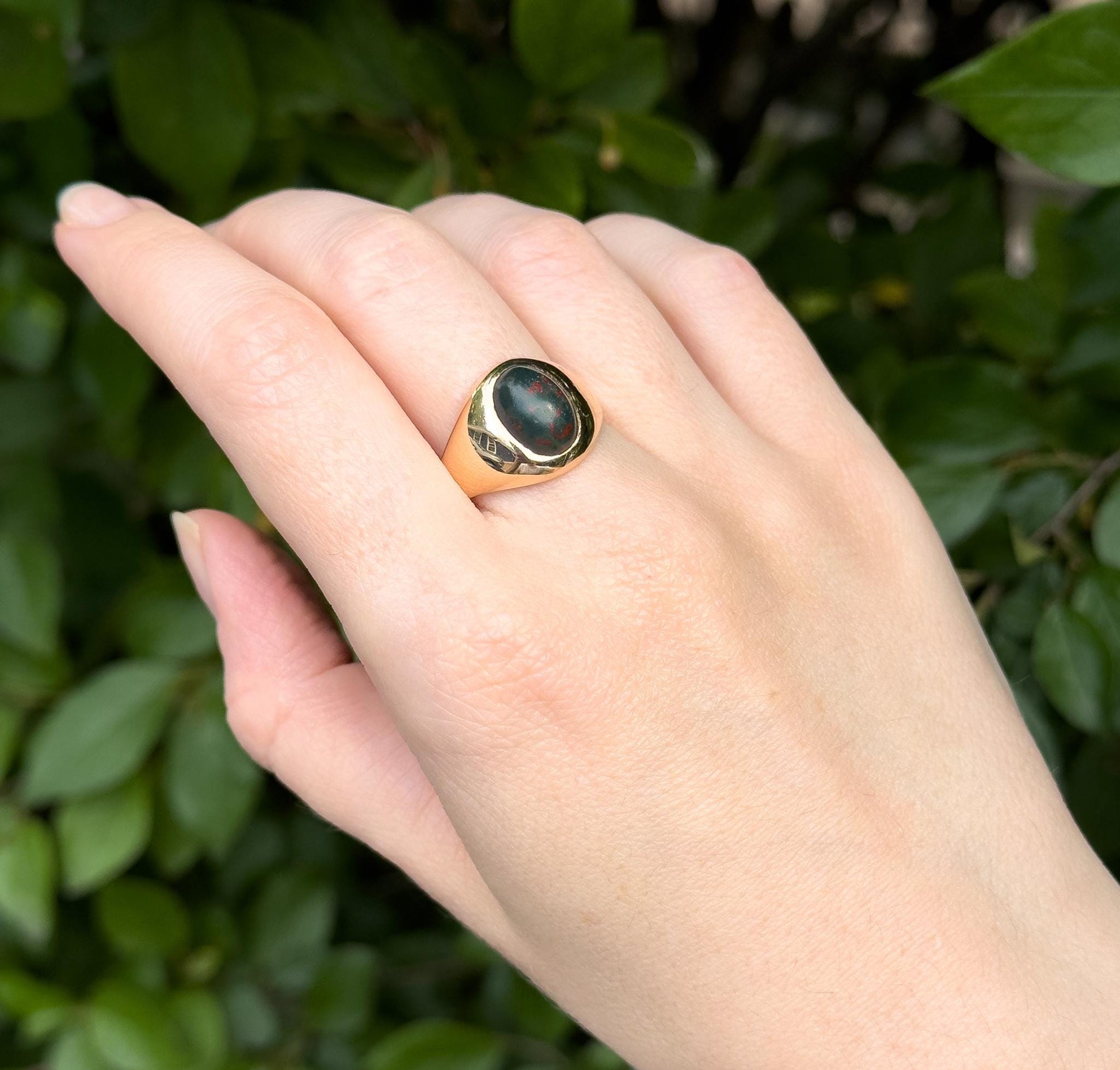 CONDITION Nice vintage condition. The bloodstone has a naturally textured surface typical of the material. Gold band shows minor age-related surface wear. Clean, wearable, and full of character. Shank is slightly oval in shape- A fantastic true vintage ring!