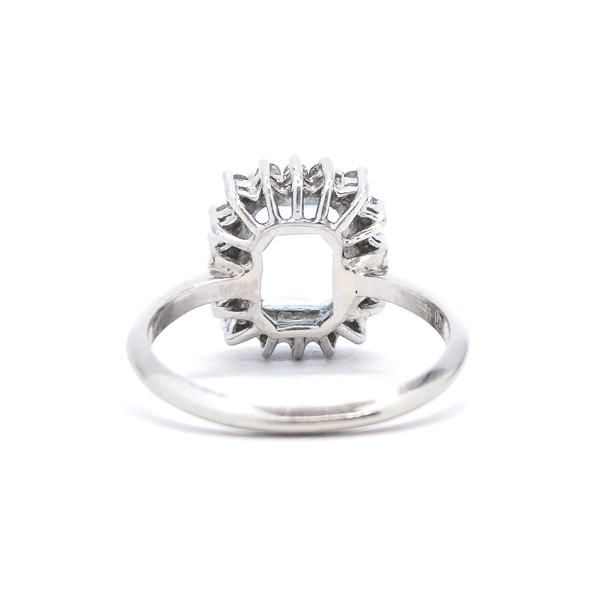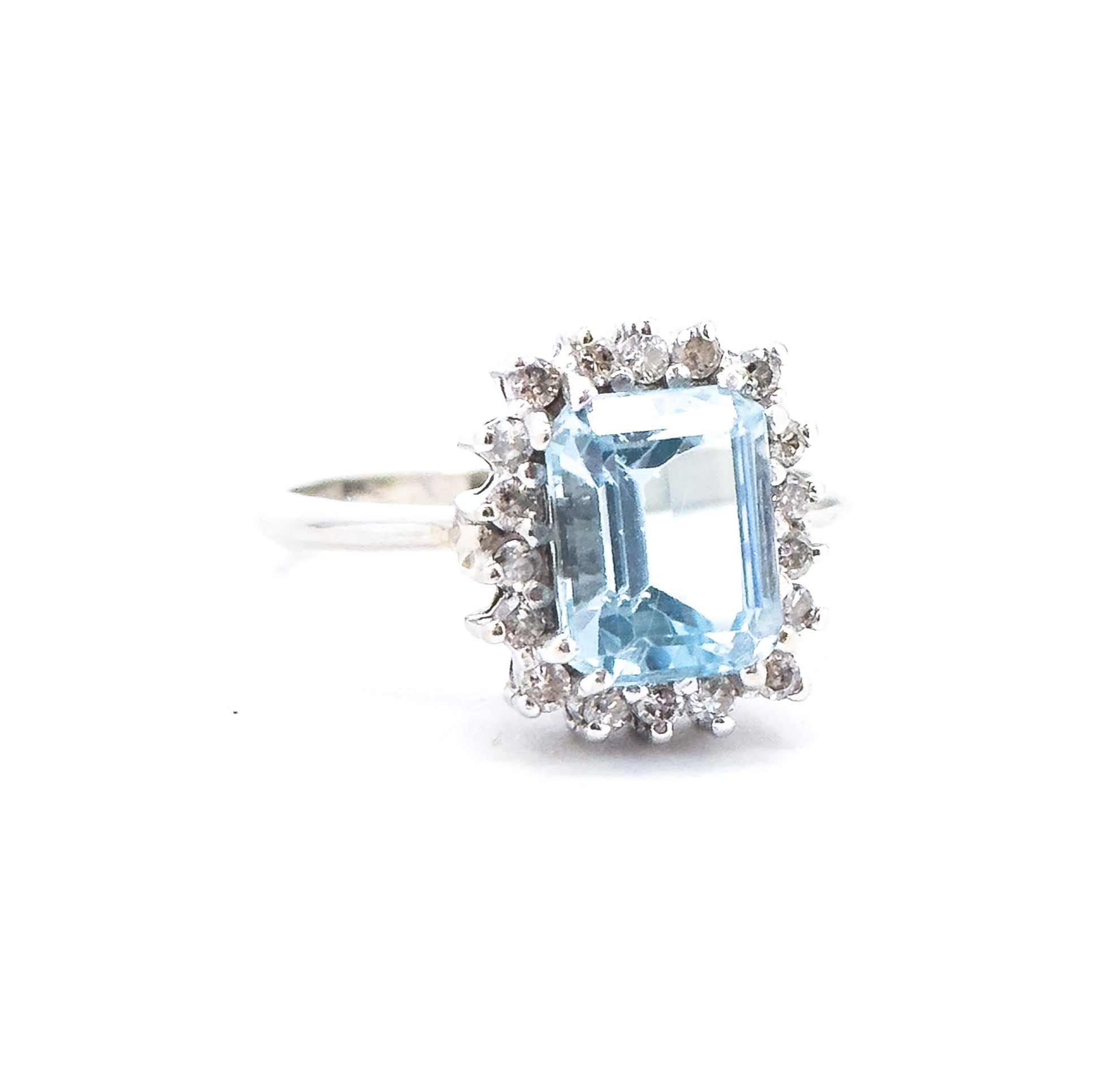 A captivating blue topaz ring: This stunning vintage ring showcases an approximately 2.8 carat emerald-cut sky blue topaz, its icy brilliance amplified by a sparkling halo of natural diamonds. Set in bright 14k white gold with a beautifully crafted basket setting, this piece offers substantial finger coverage and just the right amount of sparkle!