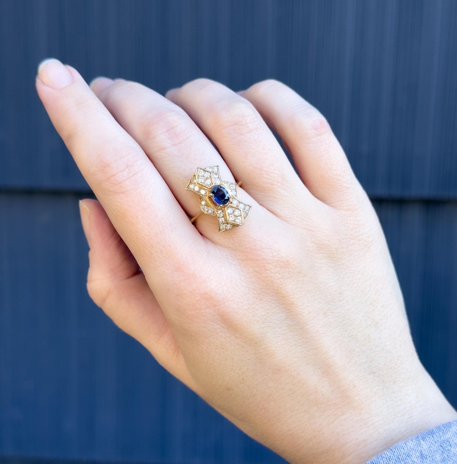 A bold vintage cocktail ring inspired by the Art Deco era, featuring a rich blue oval sapphire framed by an intricate shield design of sparkling pave diamonds. The geometric layout and stepped gold pattern echo the angular glamour of the 1920s, while the dimensional setting adds brilliance and texture. Crafted in solid 14K yellow gold, this piece beautifully bridges Deco inspiration with modern mid-century craftsmanship. The sapphire is natural and does have naturally occurring inclusions and light color zoning. With nice finger coverage and lots of sparkle, this ring will be at home in any fine jewelry collection!