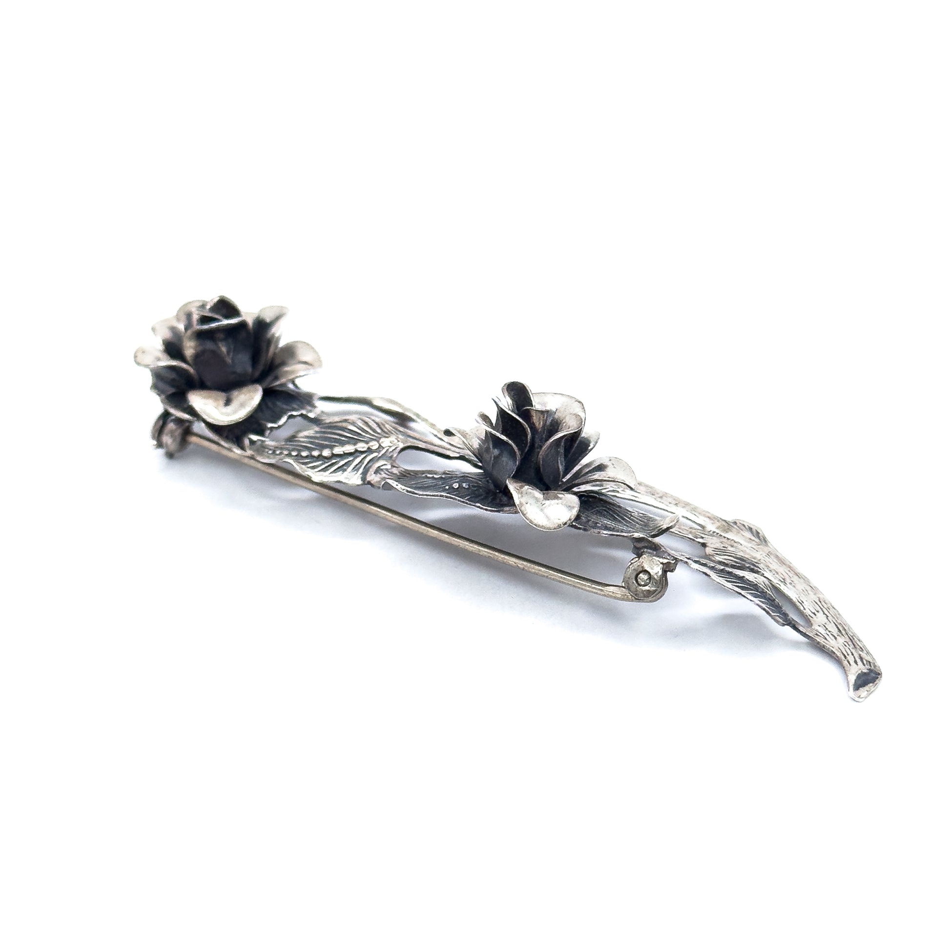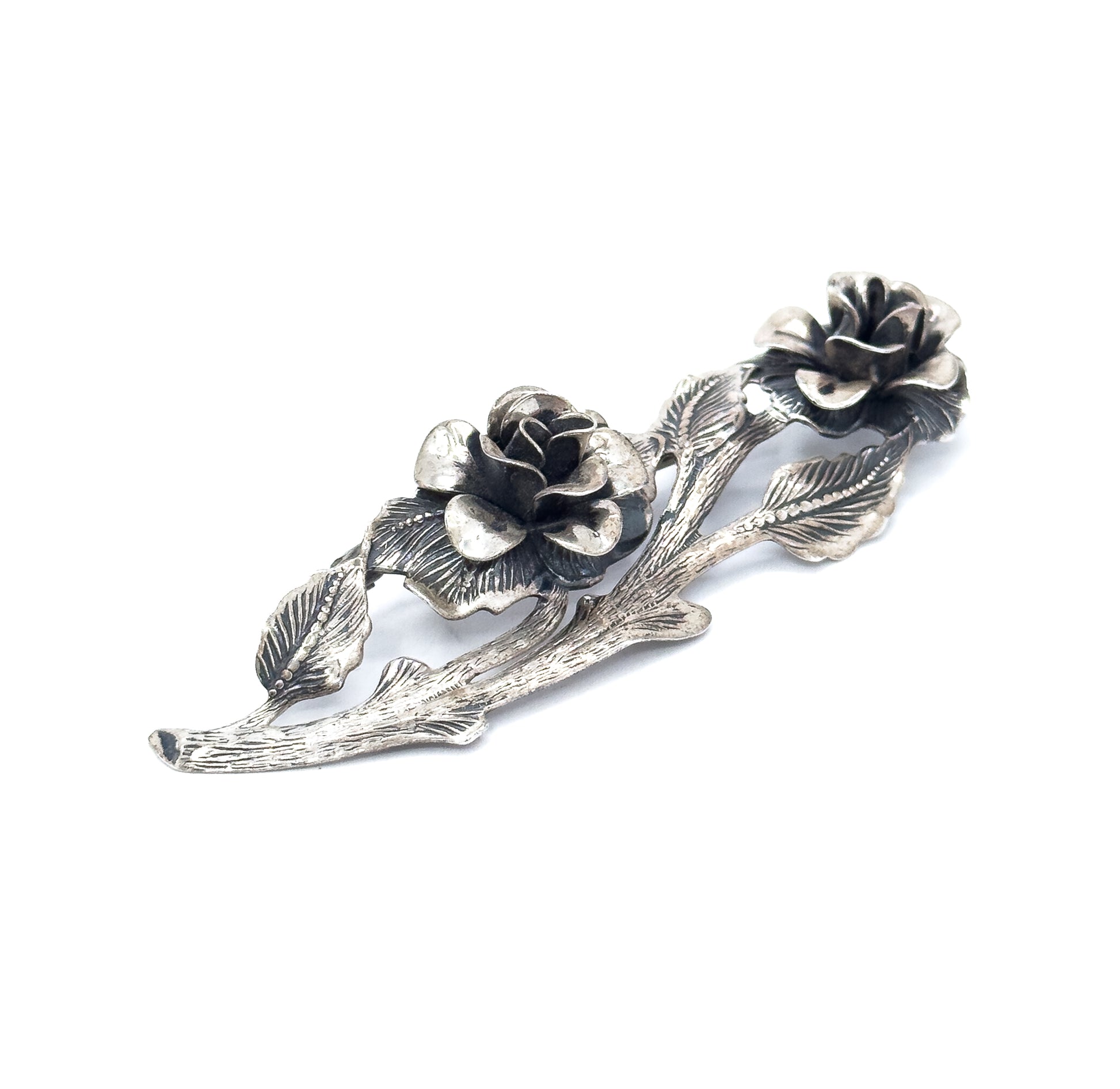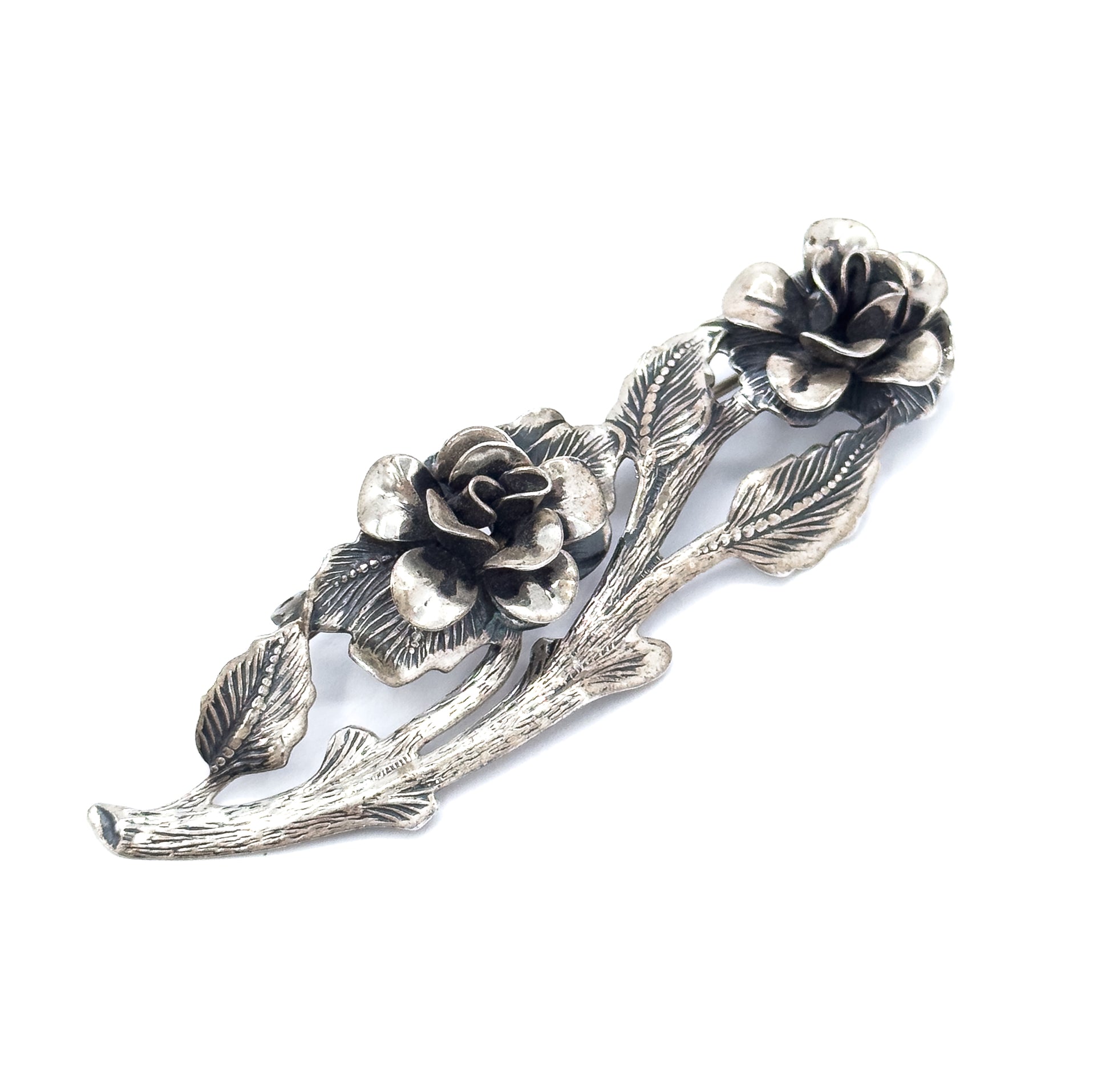 A mid-century sterling silver brooch formed as roses on a beautifully texture branch. The flowers are fully dimensional with carefully shaped petals, paired with detailed leaves and a gently curved branch that gives the piece a natural flow. Substantial without being bulky, this brooch sits beautifully and would look especially nice (we think!) worn on a blazer!