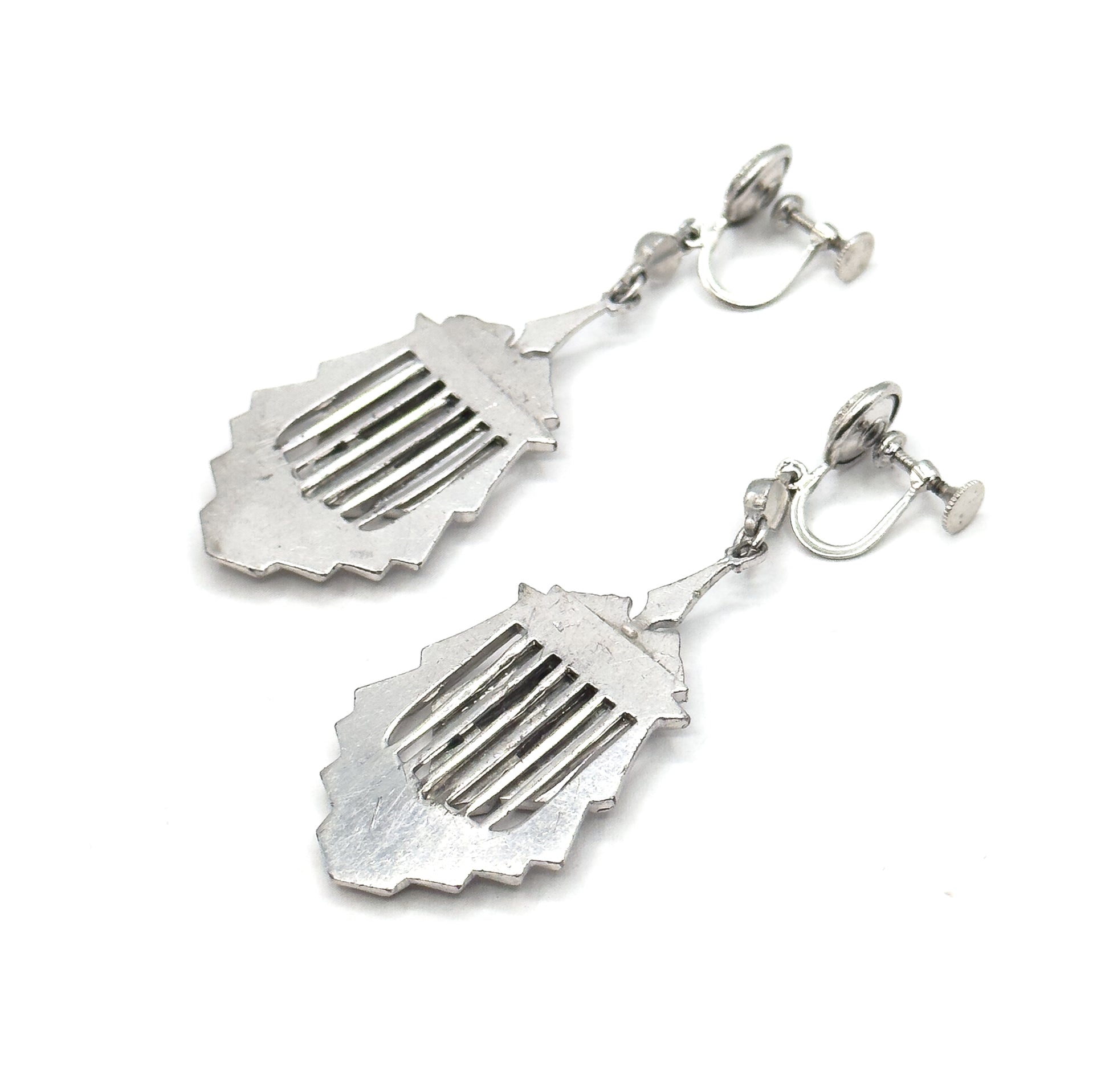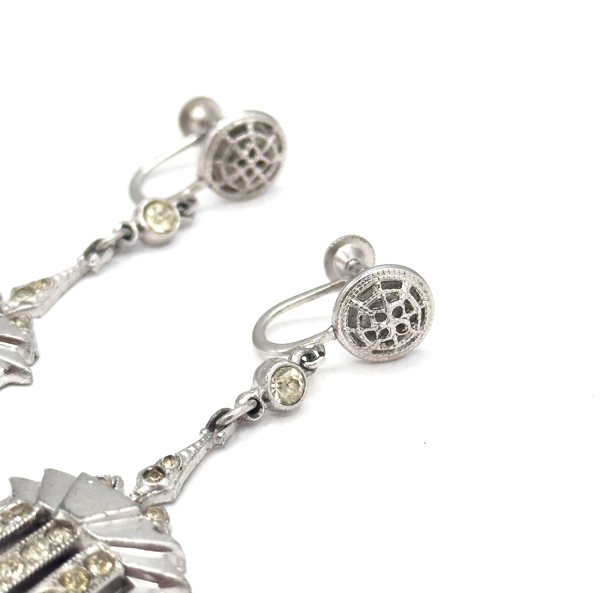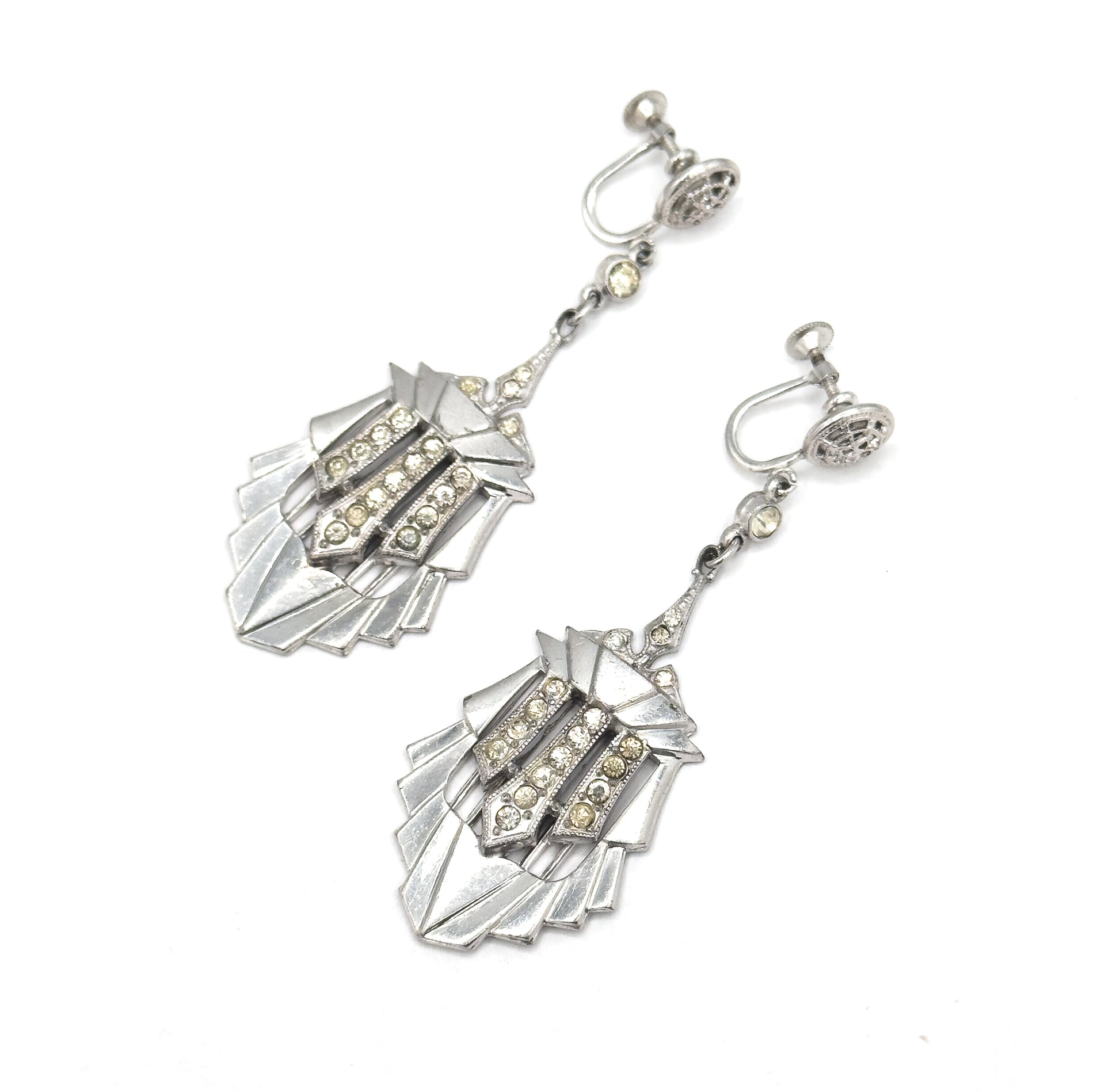 A fabulous pair of Art Deco costume earrings with bold architectural styling. These striking drops feature geometric stepped dangles with openwork details and rows of hand-cut paste gems, suspended from delicate filigree-topped screw backs. The silver tone metal and stepped, skyscraper-inspired design capture that glamorous 1920s–30s aesthetic perfectly. Some age-related yellowing to the paste is present in the old gems.