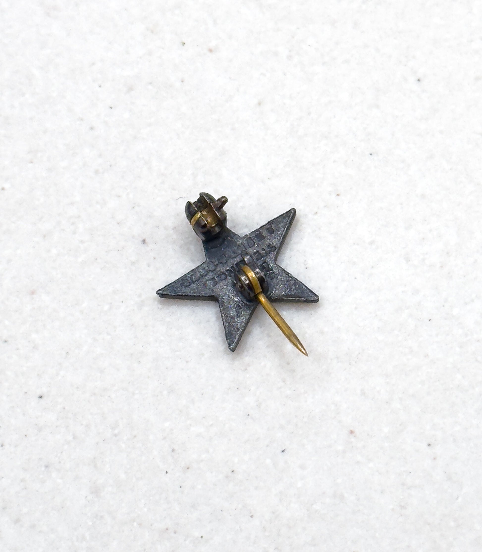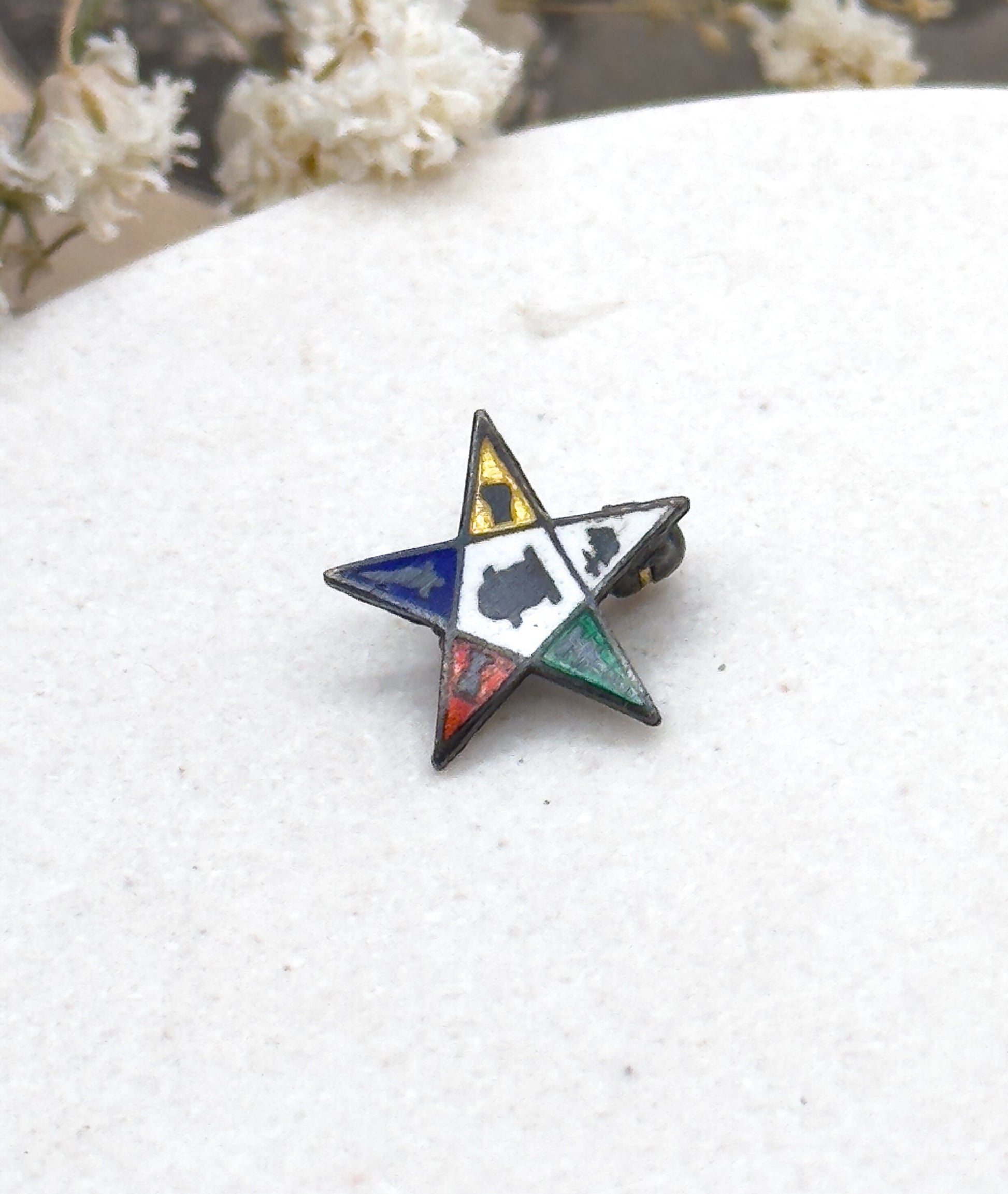 Here is a vintage Masonic Fraternal Star Pin in sterling silver. This pin is tiny, measuring about 12mm. It is about the size of a fingertip! The star features white, green, yellow, blue, and red enamel. The pin is marked sterling on the back and has a functional pin-style closure. This cool little masonic pin is ready to wear, gift, or collect.
