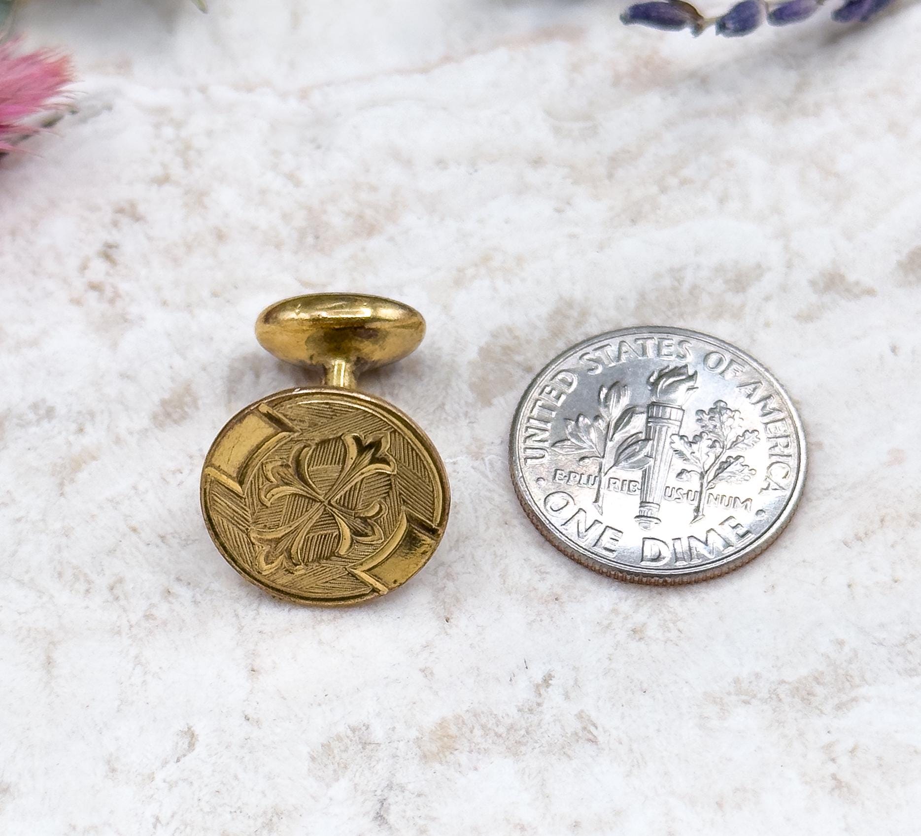 Here is a classic pair of vintage Art Deco cufflinks by Park Roger, featuring a deeply etched design in gold-tone metal The faces display an elegant etched geometric motif with stylized floral flourishes, all within a round, slightly domed profile. These cufflinks have a timeless, refined feel, perfect for vintage enthusiasts or as a gift for someone who appreciates well-crafted men's accessories. The warm gold tone pairs beautifully with formalwear and adds a touch of vintage sophistication. Would make great gift and addition to any vintage collection.