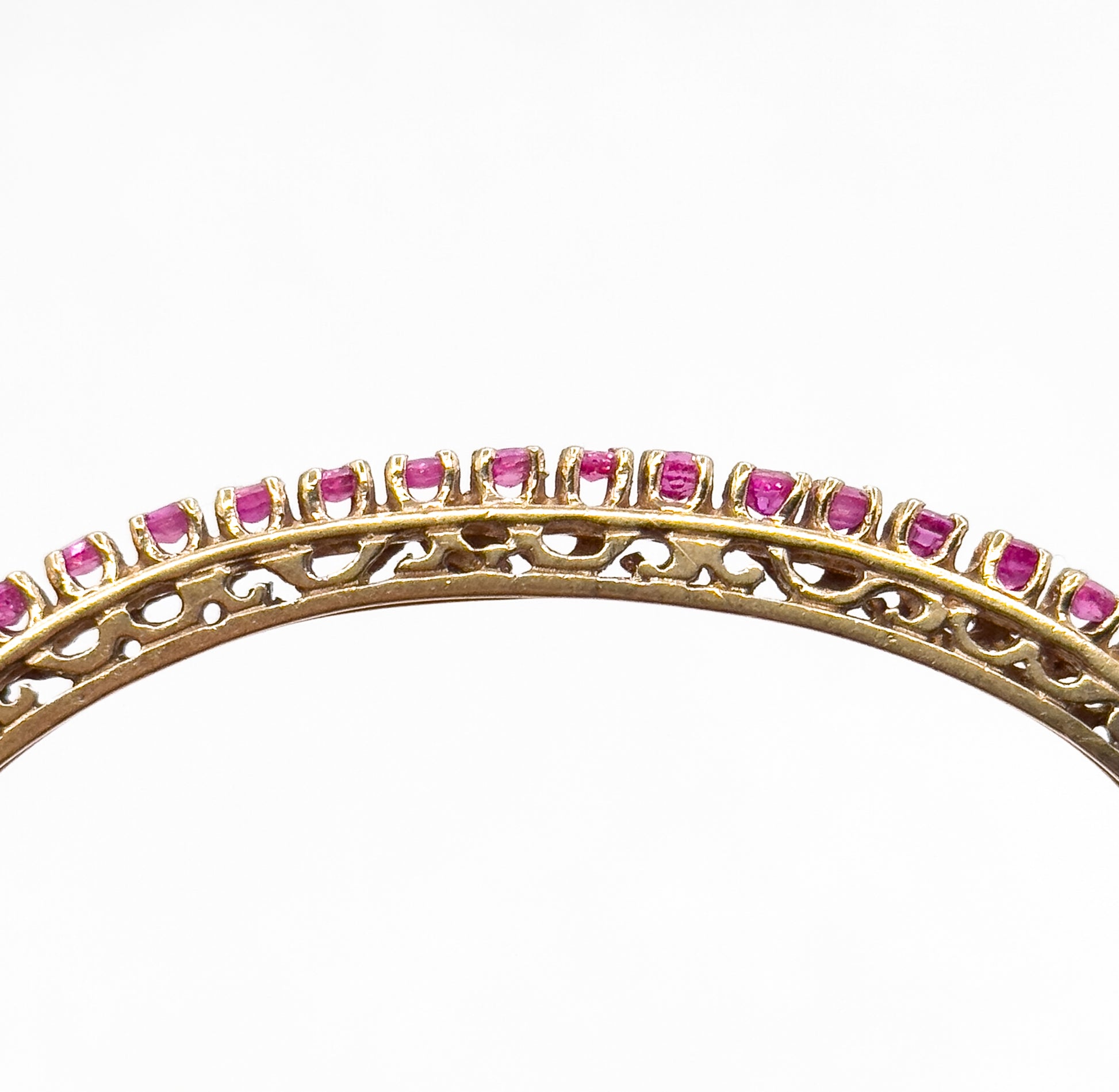 A beautifully constructed mid-century ruby bracelet featuring a continuous line of vivid reddish pink rubies across the top. The openwork gallery adds depth and texture to the design, while the hinged construction and secure clasp make it as practical as it is striking. Crafted in rich 14K yellow gold, this piece carries the bold yet refined aesthetic of mid-century jewelry design.