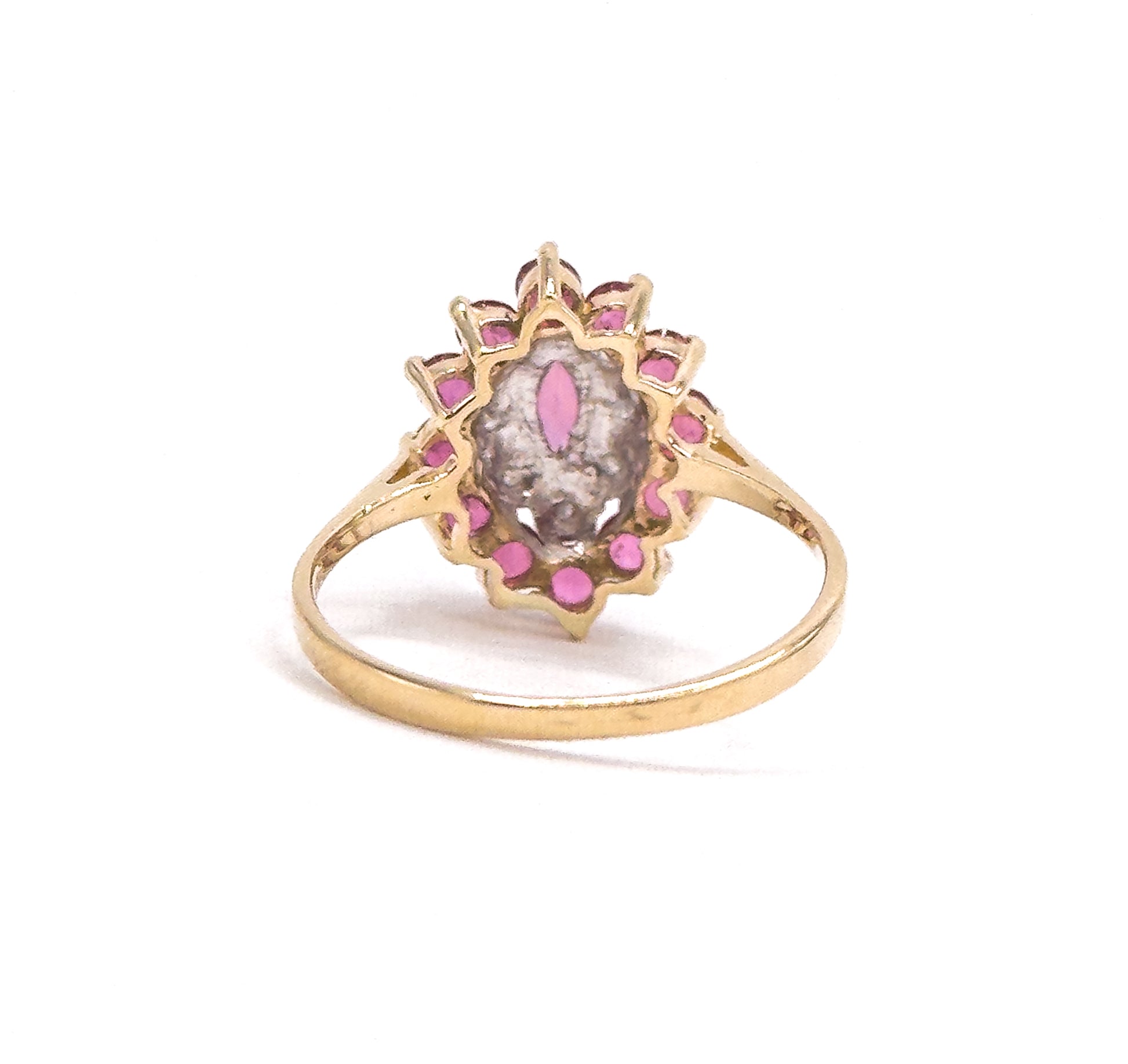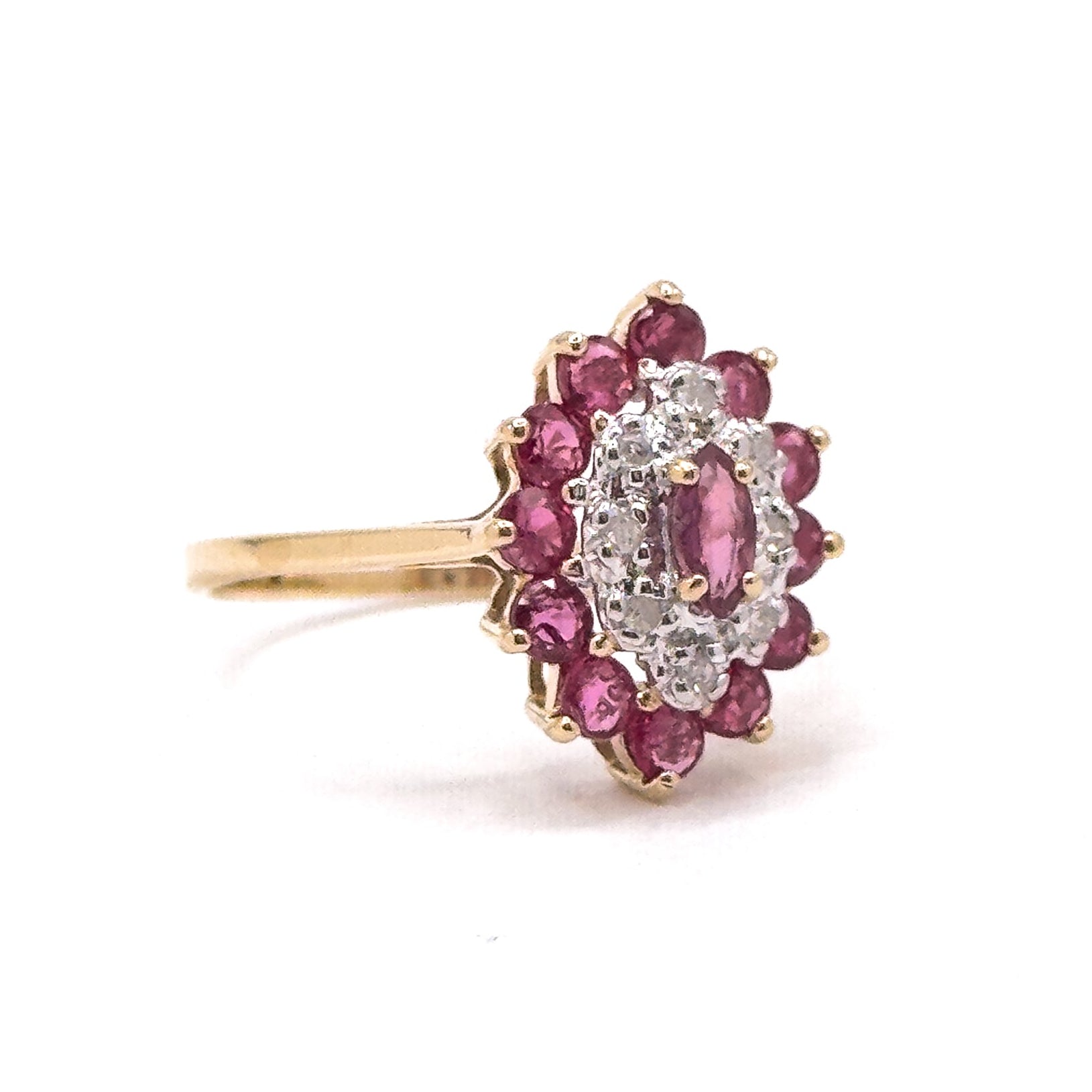 Vintage navette Cluster Marquise Ring with Diamonds and Rubies in 14K Gold