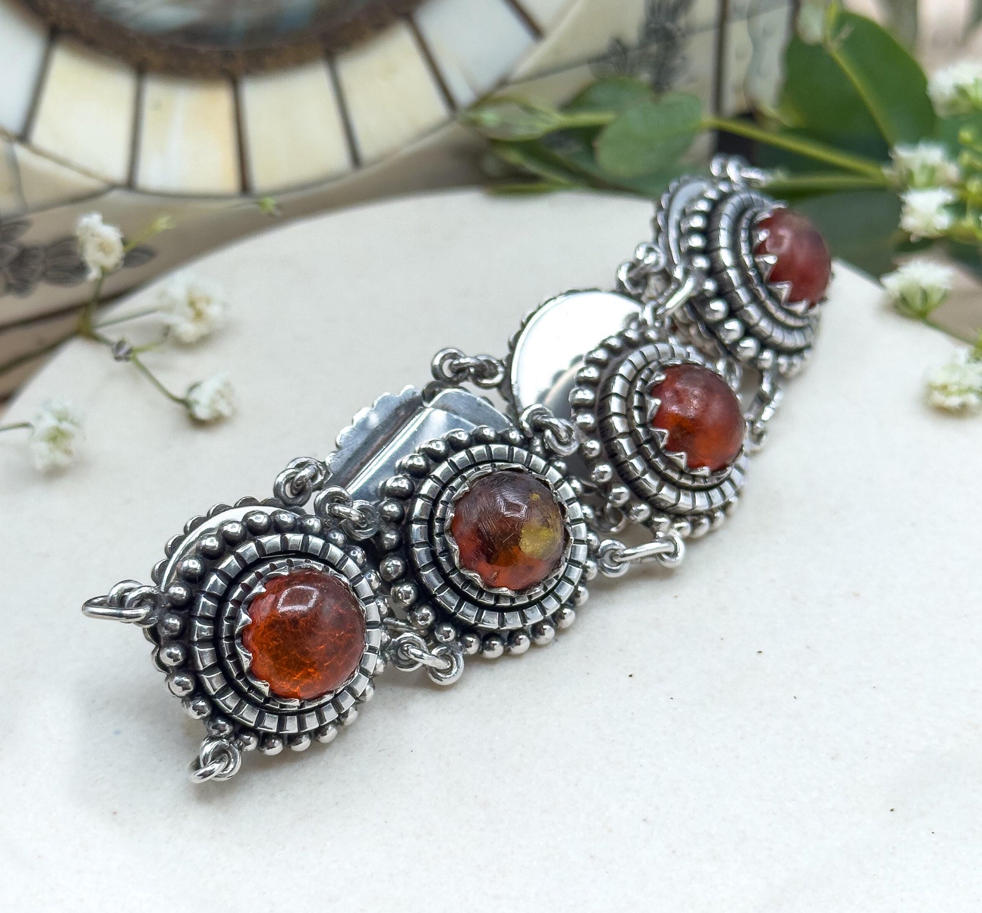 Vintage Orange Amber cabochon bracelet in 835 Silver textured vintage bracelet