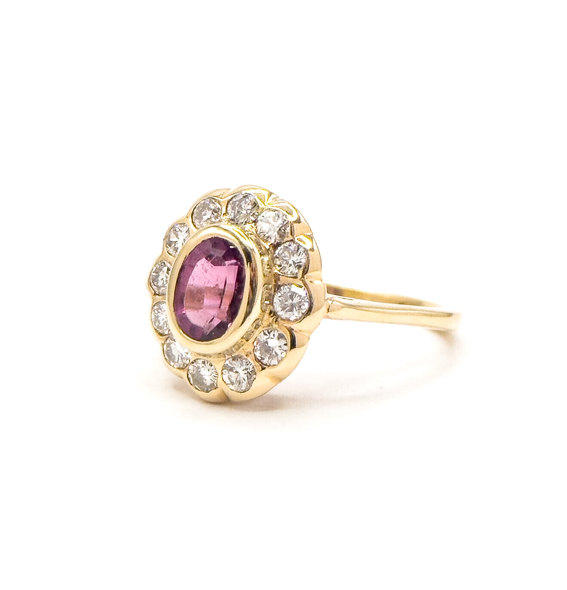 A beautiful vintage diamond halo ring featuring a vivid pink tourmaline framed in a bright, sparkling border of round diamonds. The oval tourmaline is bezel-set in warm 14K yellow gold, giving it a smooth, modern silhouette, while the surrounding diamonds create a soft scalloped halo that feels both classic and unique. The smooth bezel settings (no prongs!) make this ring perfect for someone who wears a knit sweaters. A lovely, eye-catching piece with excellent finger presence and an easy-to-wear profile.