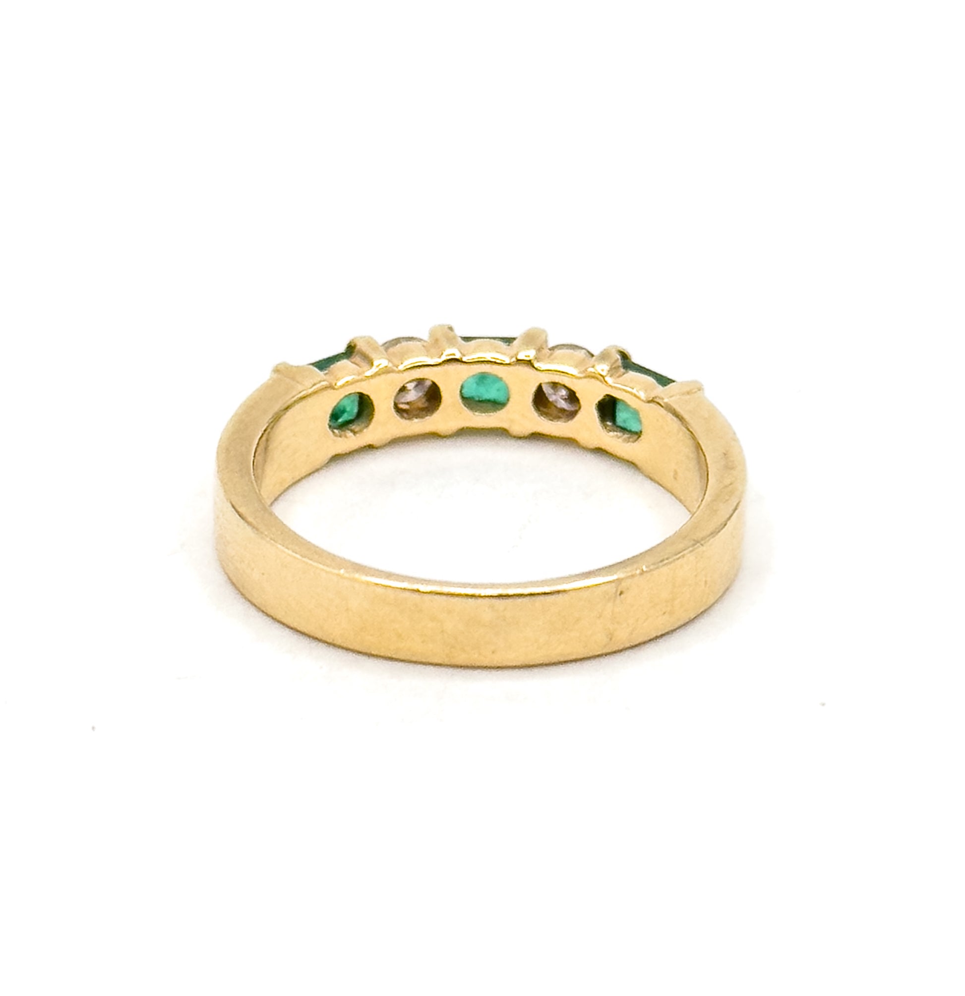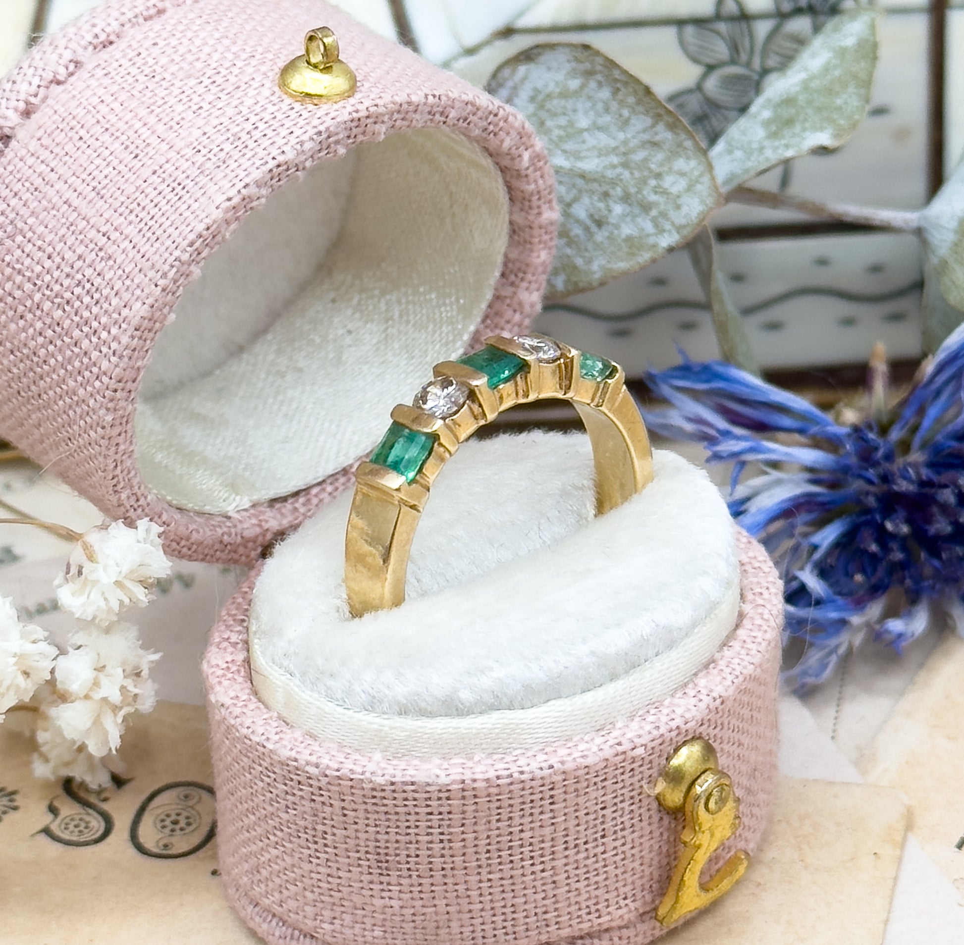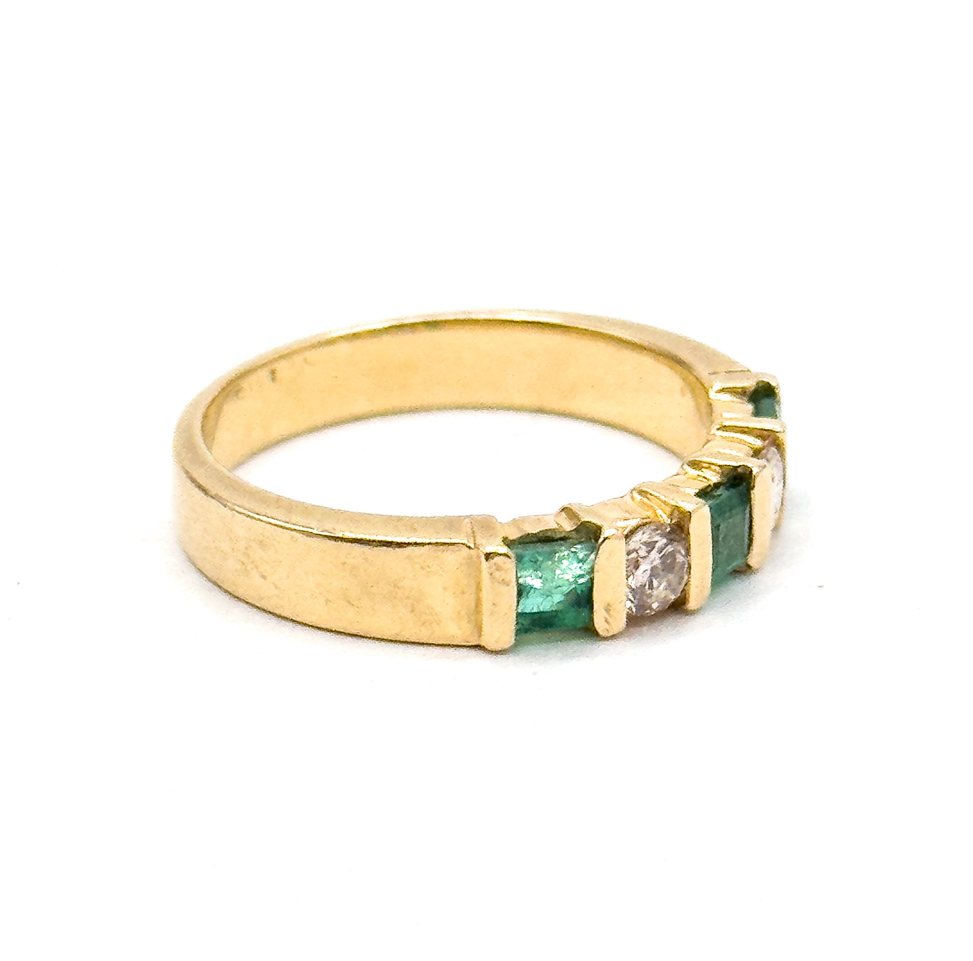 A beautifully balanced vintage band featuring alternating emeralds and diamonds set in warm 14K yellow gold. The princess-cut emeralds display a rich green hue, each framed by round brilliant diamonds in a sleek channel setting. The vintage geometric design offers a timeless late-20th-century look. On of the emeralds has a surface reaching inclusion seen best in the video. This awesome rings looks great stacked with other pieces or worn on its own.