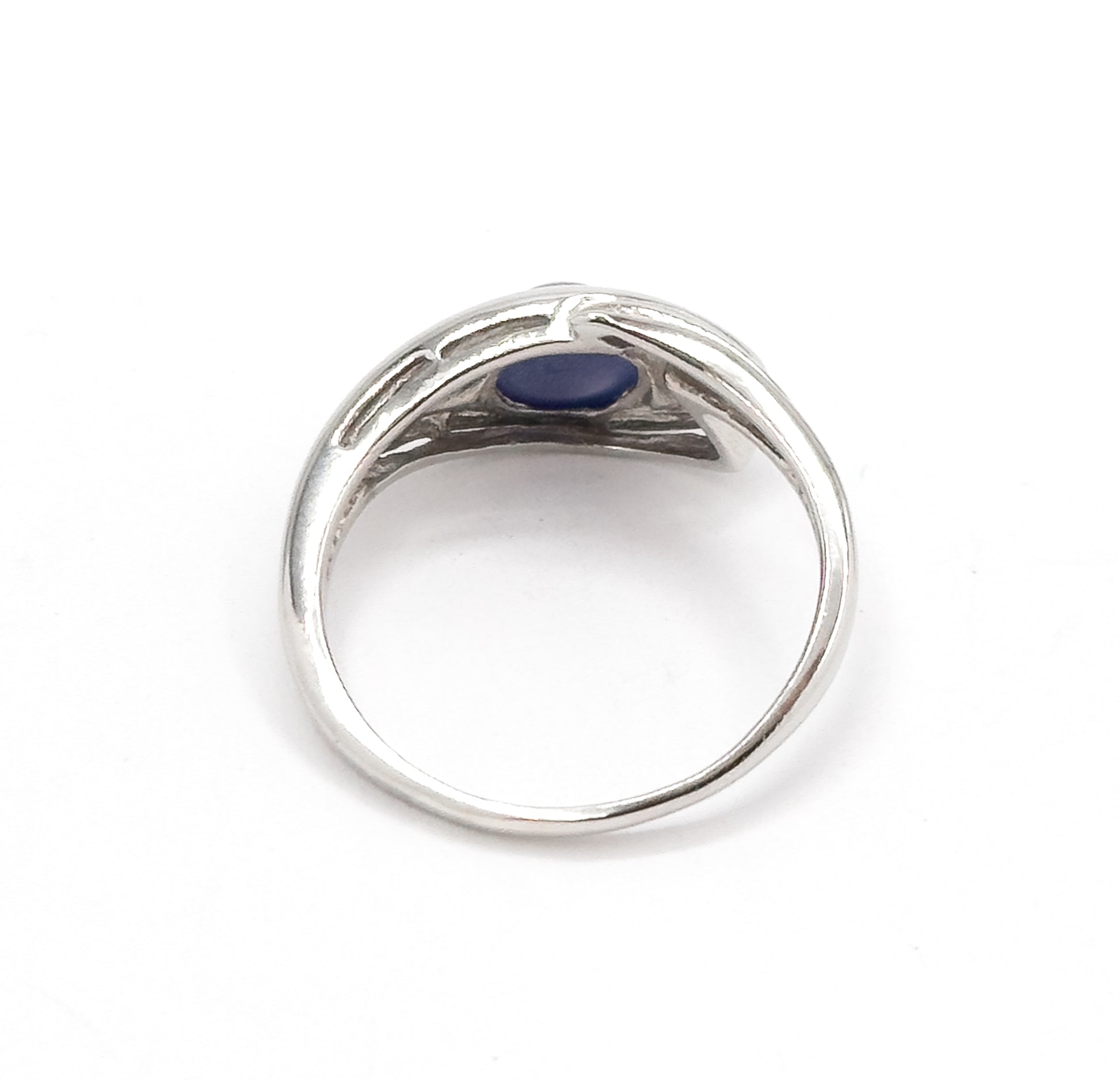 A fun vintage asymmetrical star sapphire ring set with a deep blue synthetic cabochon that displays a star (asterism) in the right lighting. The bold, off-center design and clean white gold mounting reflect mid-century American style. Synthetic star sapphires were especially popular from the 1950s–1970s, prized for their dramatic star effect and saturated color at an accessible price point.
