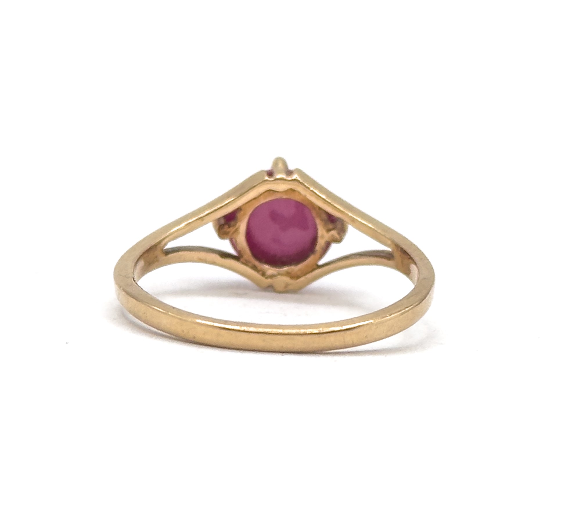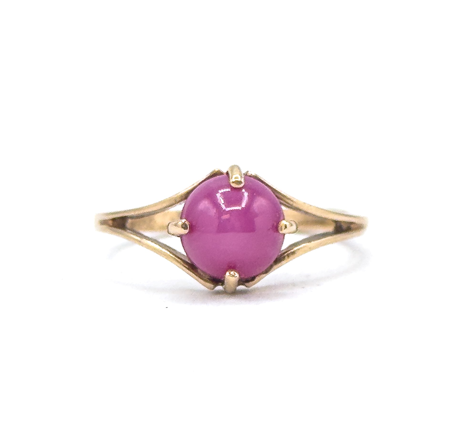 A vintage ring set with a synthetic Linde-style star sapphire cabochon displaying a six-pointed asterism under direct light. The stone has a deep pink hue and is secured in a simple prong setting. Finished in 10K yellow gold with a clean, minimal profile. This cute vintage star sapphire is ready to wear or collect!