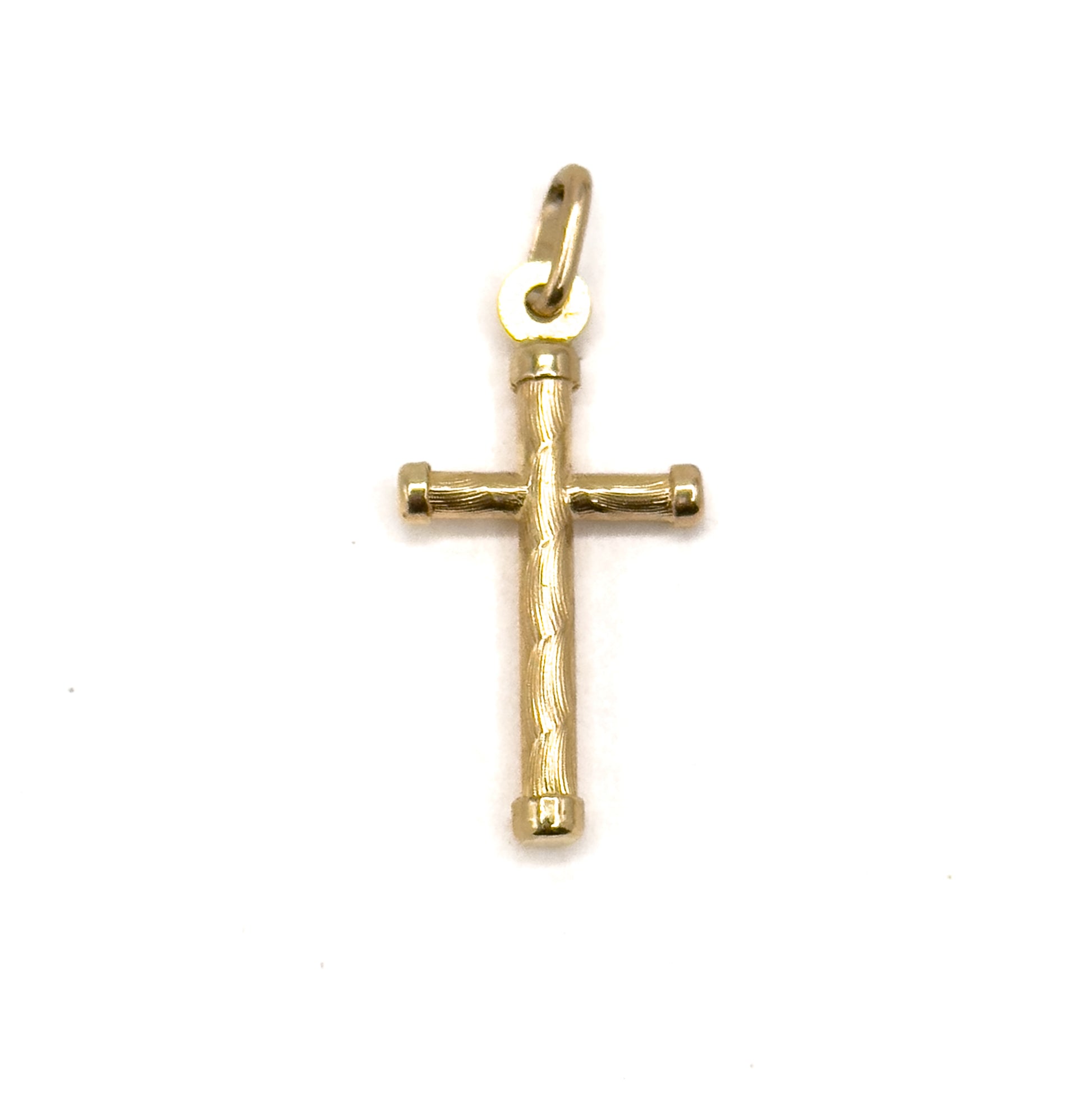 A classic vintage 14K yellow gold cross pendant with a beautifully textured surface that almost gives the appearance of fine brushed gold. The design is clean yet detailed, making it perfect for everyday wear or as part of a layered necklace. Lightweight and timeless, this piece is fully tested and stamped for 14K gold purity. Ready to wear or gift!