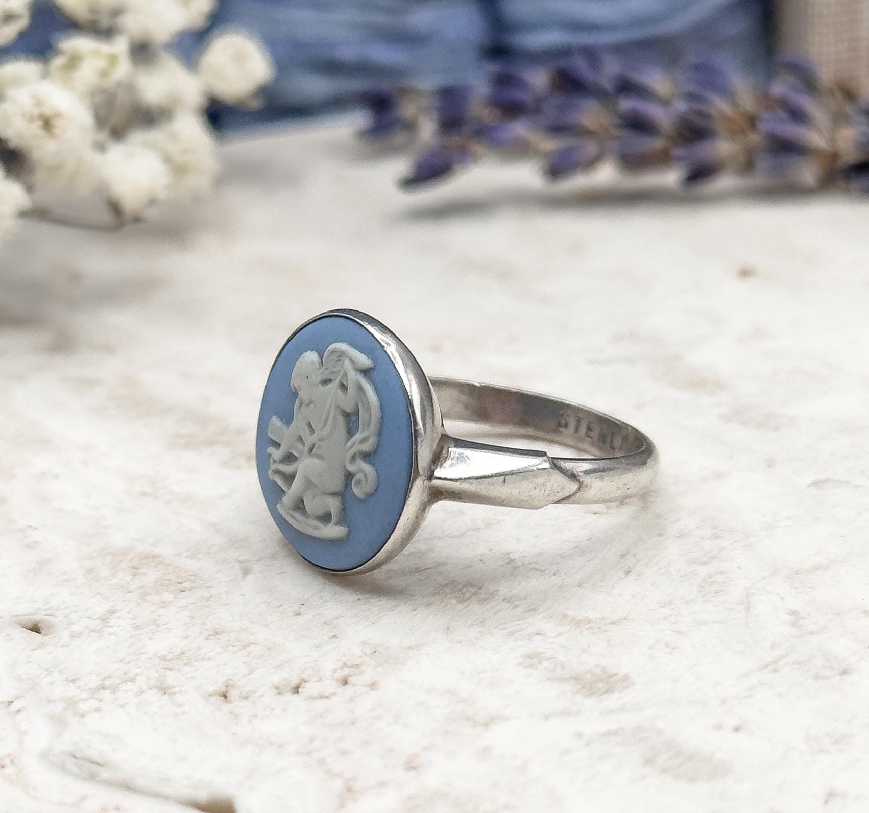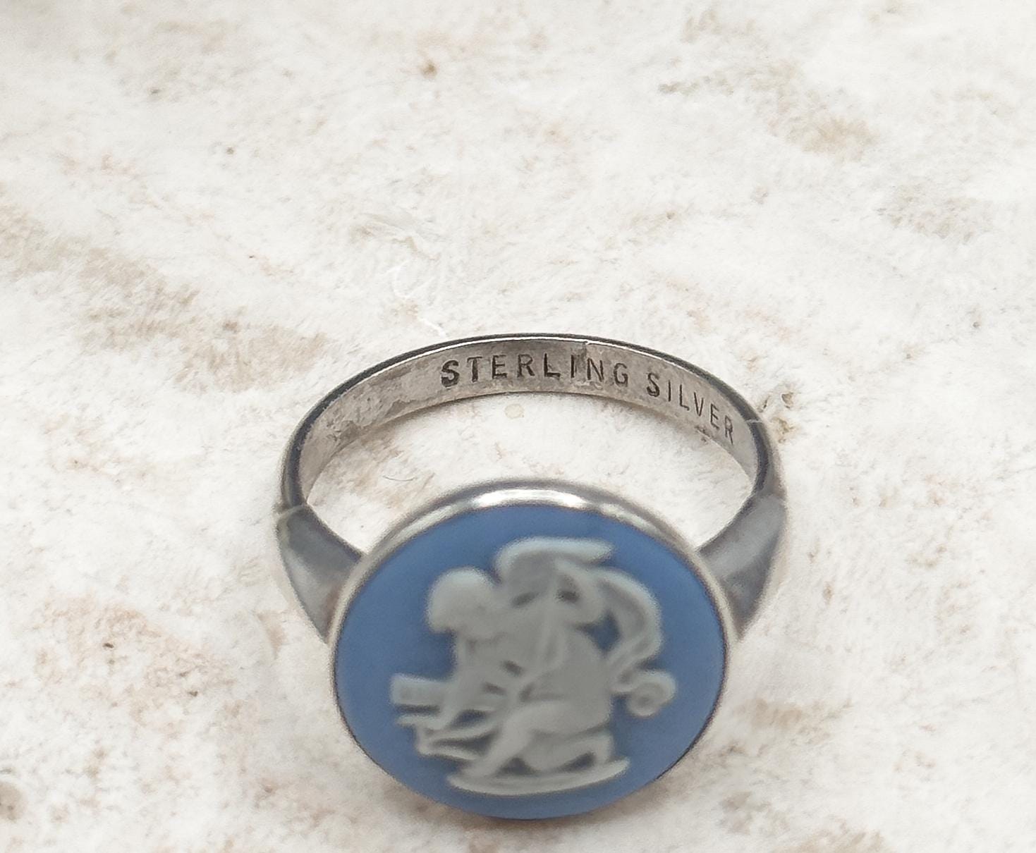 CONDITION This cute vintage wedgewood ring is vintage and sold in pre-owned condition. There is light age-related surface wear and patina on the silver. A very cute vintage ring!